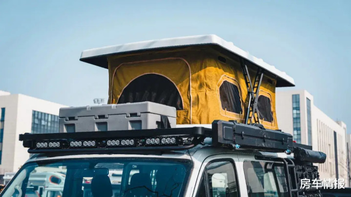 车顶采用的是一套电动剪式升降帐篷,内部可以搭建出一个尺寸为1.3米×1.95米的双人床,不过需要注意的是,升顶帐篷的材质相对比较薄,只能在春夏以及初秋季节时候,如果赶上低温天气是无法使用的。