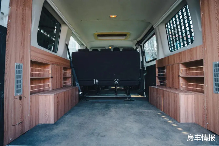 最后来看一下生活区的设计,和主流宿营车不同,这款车则主打的是个性化DIY设计,内部几乎就是一个毛坯的状态,原厂仅提供了两侧的小型简易家具,其他的空间完全交给车主自己设计,不管是固定床、大型储物箱、折叠餐桌、办公桌等等,都可以个性化选装。